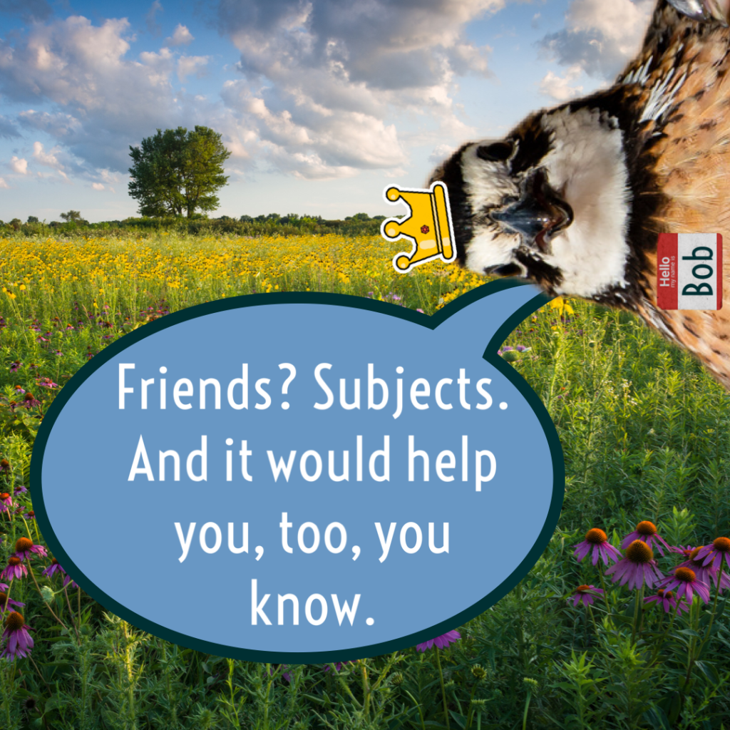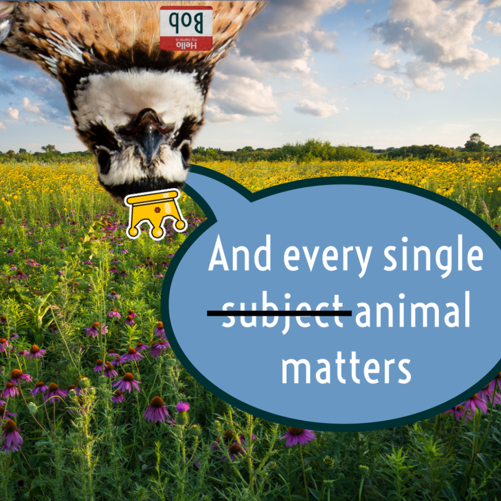 But more prairie friends might work out better than subjects, don’t you think, Bob? Bob is right, though. Every animal we send to the prairie helps us maintain our sliding tuition scale and builds our own community!